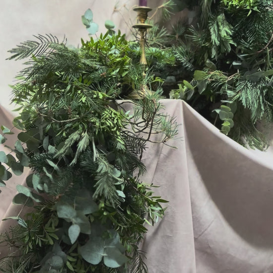 A generous, natural garland brimming with fragrant festive greenery — think cedar, spruce, pine, eucalyptus and seasonal foliage gathered and arranged with care. Each one is made by hand in our studio using traditional, sustainable methods.
