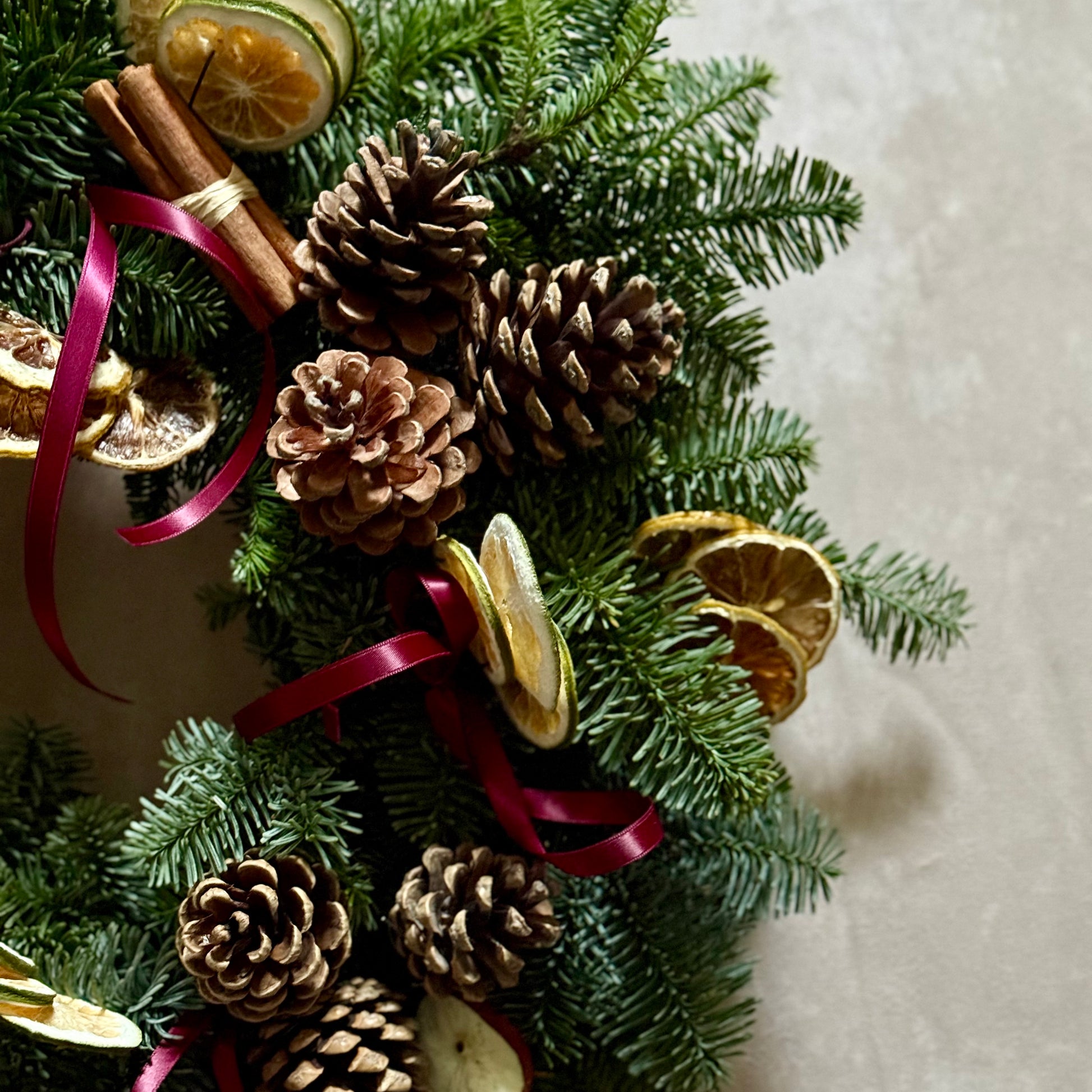 A proper classic. Lush, fragrant fir dressed in all the festive trimmings that make a front door feel like Christmas has actually arrived. This traditional wreath is packed with dried oranges, limes and apple slices, clusters of warm pine cones, and generous curls of cinnamon for that unmistakable seasonal scent.